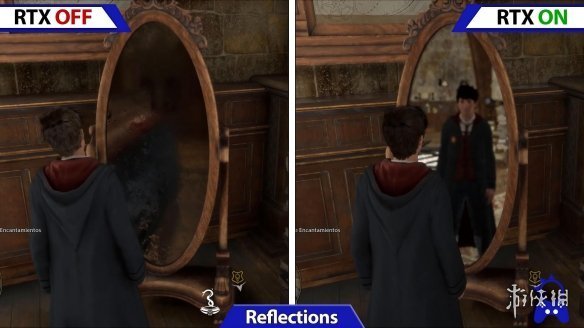 視頻里的對比還是比較明顯的,開啟光追後陰影質量顯著提升,變得更有層次感。反射效果則尤為明顯,原本幾乎無法映照角色外觀的鏡子在光追的加持下,也能顯示較為模糊的身影。