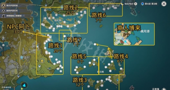 此外,有一個npc阿卜,對話可得3個星螺,一次性的。璃月港萬有鋪子的商人博來處可以購買5個,一周刷新一次。這一趟下來總共有85個。
