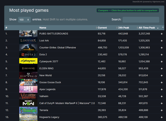 根據SteamDB的數據,Avalanche Software工作室開發的開放世界動作角色扮演遊戲《霍格沃茲之遺》在線人數超越了《輻射4》,截稿時已達到了48萬9千人,成為僅次於《賽博朋克2077》(105萬)的第二大單機遊戲。目前,在steam的最常玩遊戲榜單中,《霍格沃茨之遺》的總排名在第13名,值得一提的是,前十榜單中只有《賽破朋克2077》是僅支持單人玩家的遊戲。
