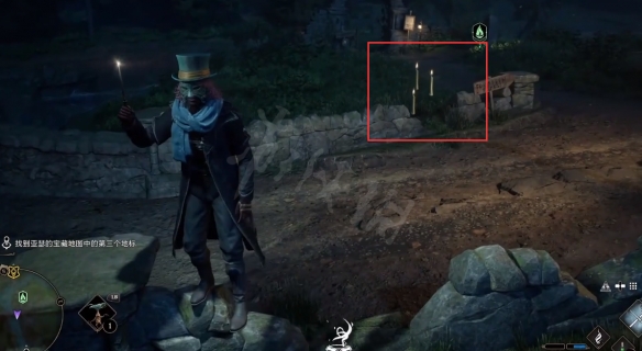 觀察地圖能發現,森林,傳送點,橋,熒光閃爍,蠟燭。所以根據線索推測,禁林門口的傳送點,朝箭頭方向(傳送點外)走,找到橋並且打開熒光閃爍(夜間)。