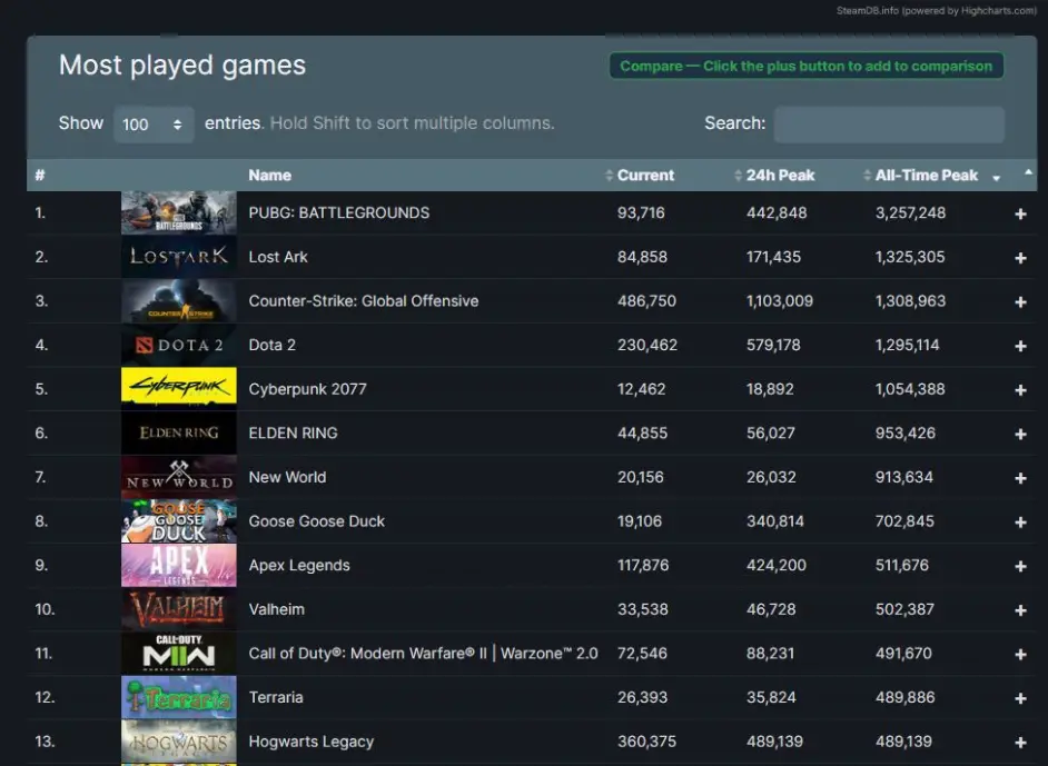 根據SteamDB的數據,《霍格沃茨之遺》現在的在線人數已經達到了快要五十萬,一舉超過了《輻射4》直逼《COD19》,要知道今天標准版玩家都還沒進局,只有豪華版玩家能夠提前體驗遊戲,可以說是非常離譜。