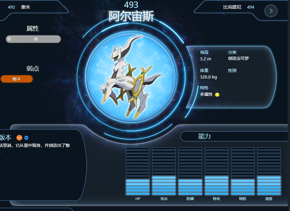 2、阿爾宙斯是一般屬性的寶可夢,弱點是格鬥系,特性是多屬性,自身的能力值都非常高,在攻擊和速度方面較為突出,是很多玩家都很喜歡的一隻寶可夢。