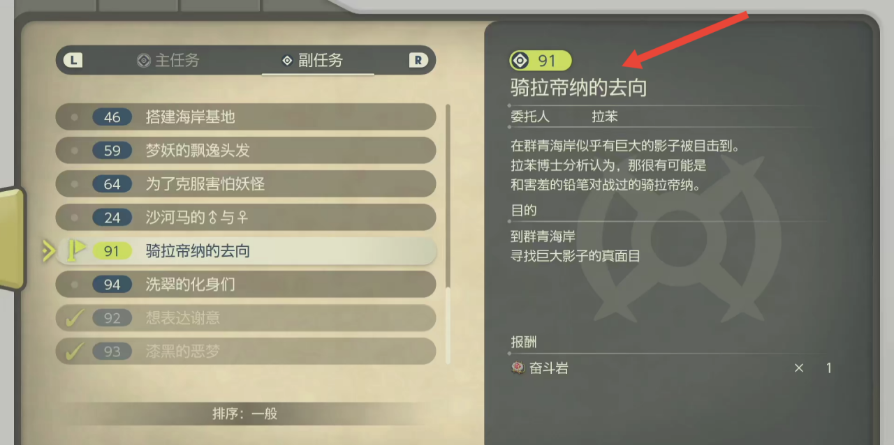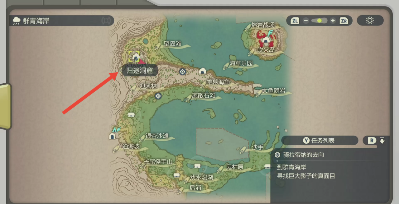 1、寶可夢傳說:阿爾宙斯抓騎拉帝納,首先需要領取劇情任務:騎拉帝納的去向,再進入到群青海岸的隱泉之路,在這里進入山洞,如下圖所示: