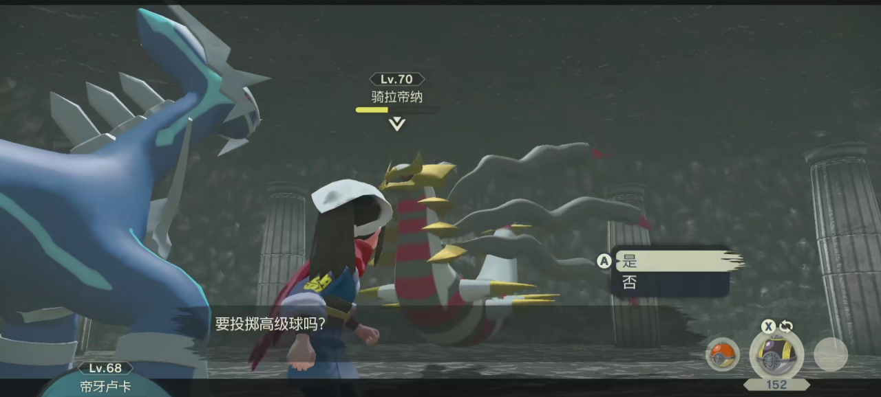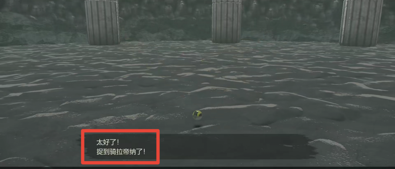 2、在山洞裡就可以找到騎拉帝納,我們與其戰鬥將它攻擊至殘血,然後扔出高級球就可以捕捉成功了,如下圖所示: