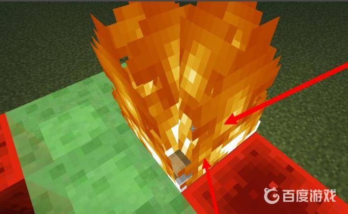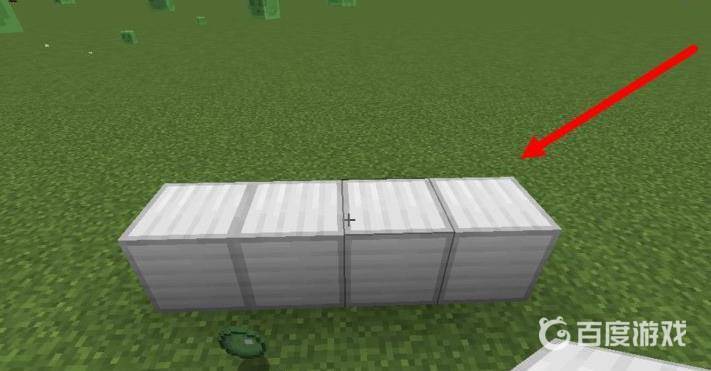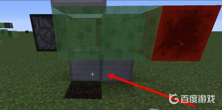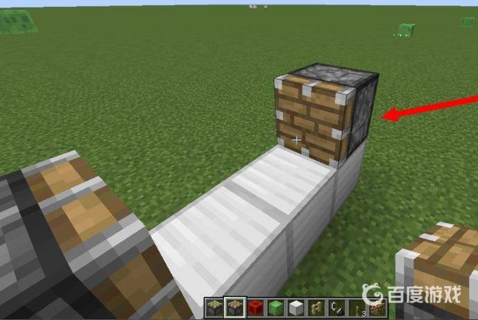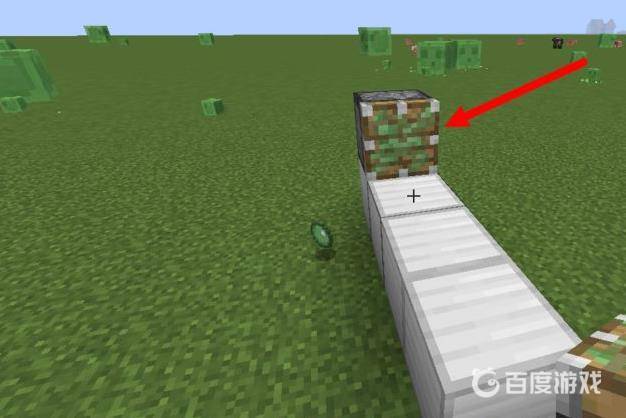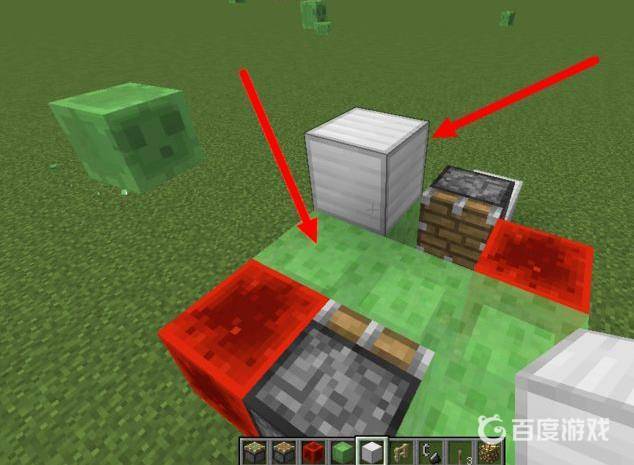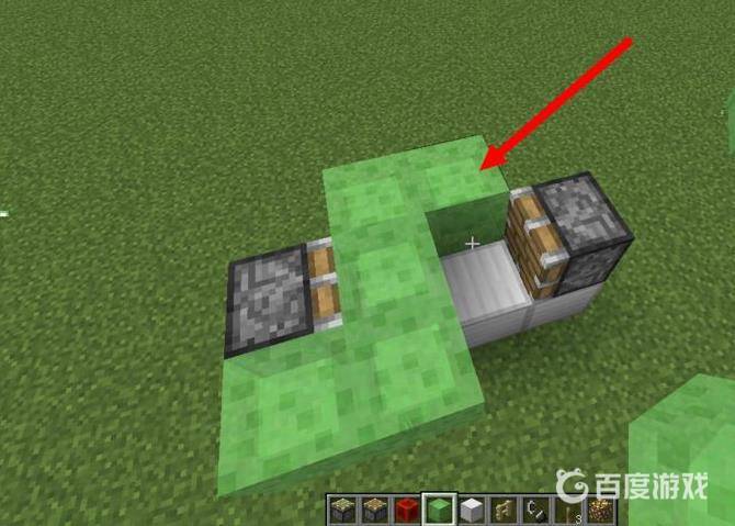 7、接著在上邊靠近普通活塞的粘液塊上放一個方塊,這就是擋著你的,你就站在這個方塊的前面,也就是圖中箭頭指的位置