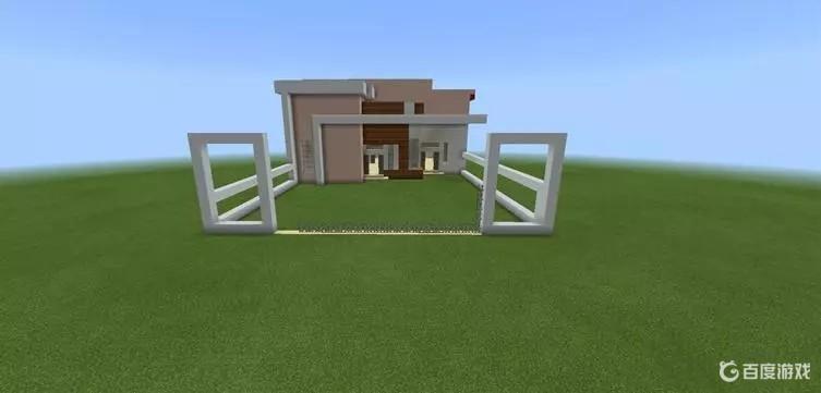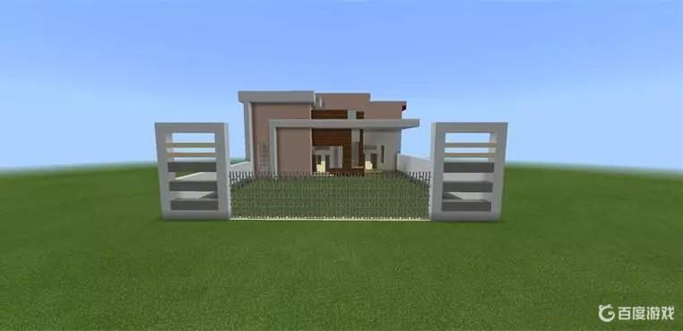 13、使用閃長岩間隔1填充,豎牆頂端使用石英台階填充,正側大門使用鐵柵欄連接高度4,完成以後別墅整體完工。