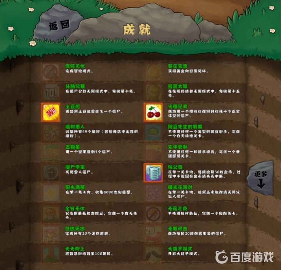 植物大戰僵屍1中所有成就一共有22個,植物大戰僵屍並沒有非常難的成就,只有不動的肝。分別如下: