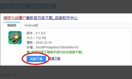4、如果要下載的是pc版,安裝了百度雲盤的話,點擊高速下載,然後就可以下載了。