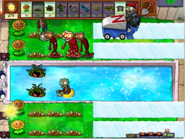 2、在第一波僵屍來臨的時候,草地防禦體系已基本完善,每行種下三株地刺就能防止雪橇僵屍的偷襲,就算雪橇僵屍與冰車僵屍一同前進,冰車僵屍毀掉第1株地刺後,我們也可以迅速補上,並不會影響到安全。