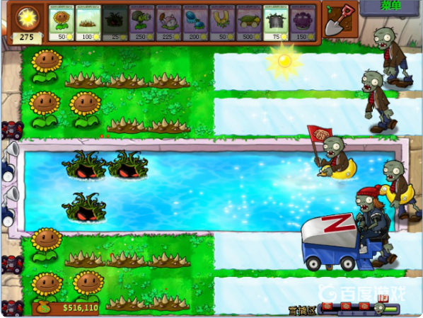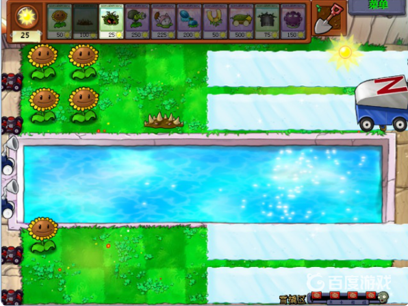 1、通常情況下,地圖上出現的第1隻僵屍會是冰車僵屍,此時我們應該已經種下了5~6株向日葵,並且攢下了150左右陽光,所以我們有充足的陽光種下地刺,並且可以繼續發展向日葵陣地。
