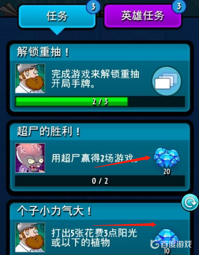 首頁 植物大戰僵屍 問答 植物大戰僵屍英雄怎麼刷寶石? 2023-02-09 植物大戰僵屍英雄刷寶石的具體的方法就是需要玩家每一天完成三個每日任務來就可以刷鑽石,獲取任務的獎勵鑽石了,這些任務的難度不是很高,在任務的界面中可以查看到對應任務的需求,按照要求完成即可獲得獎勵。