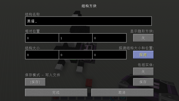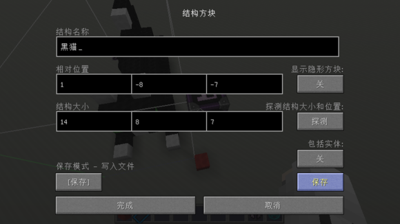 2.在角落方塊的對角高出黑貓的地方發一個結構方塊開【保存模式】名稱一樣是黑貓