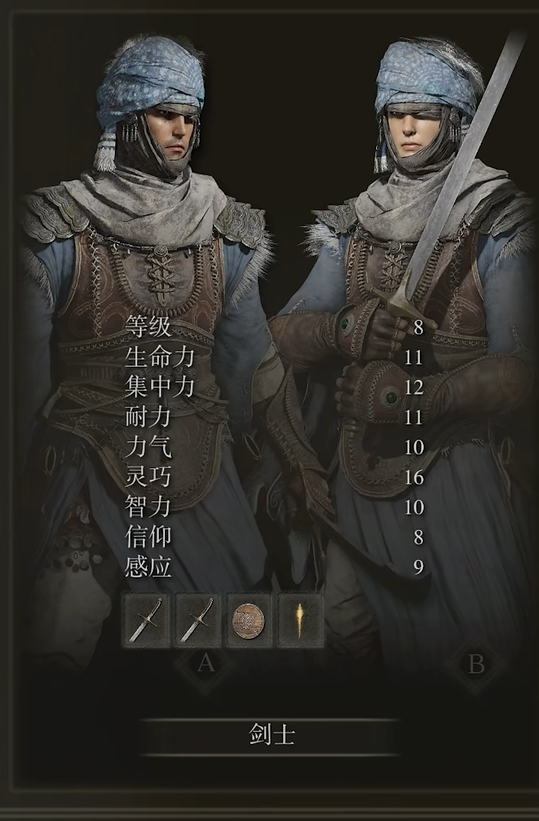 1、劍士是一位流浪民族戰士,被譽為帶著傑出技巧出生的戰士。它的初始生命力為12點、集中力為10點、耐力為13點、力氣為11點、靈巧為15點、智力為9點、信仰為7點、感應為10點,可以使用單手劍以及雙手大劍武器。