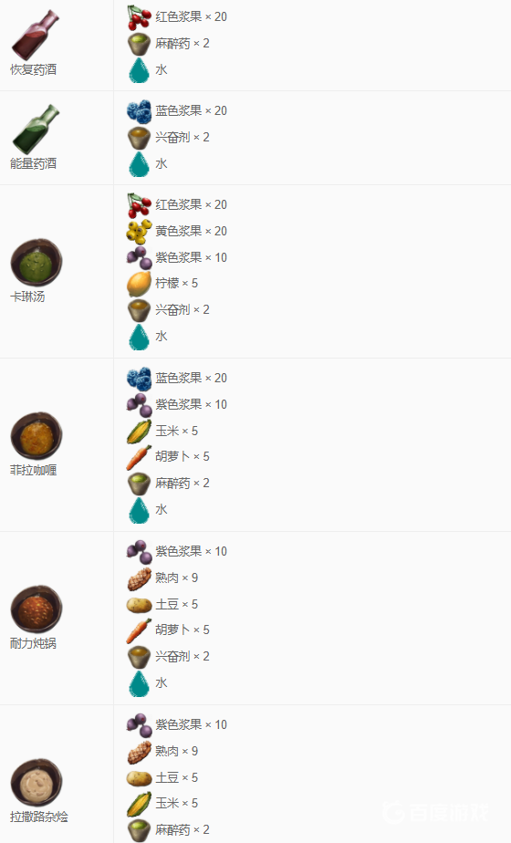 烹飪配方圖鑑內容有:恢復葯酒:紅色漿果 × 20、麻醉藥 × 2、水。能量葯酒:藍色漿果 × 20、興奮劑 × 2、水等等