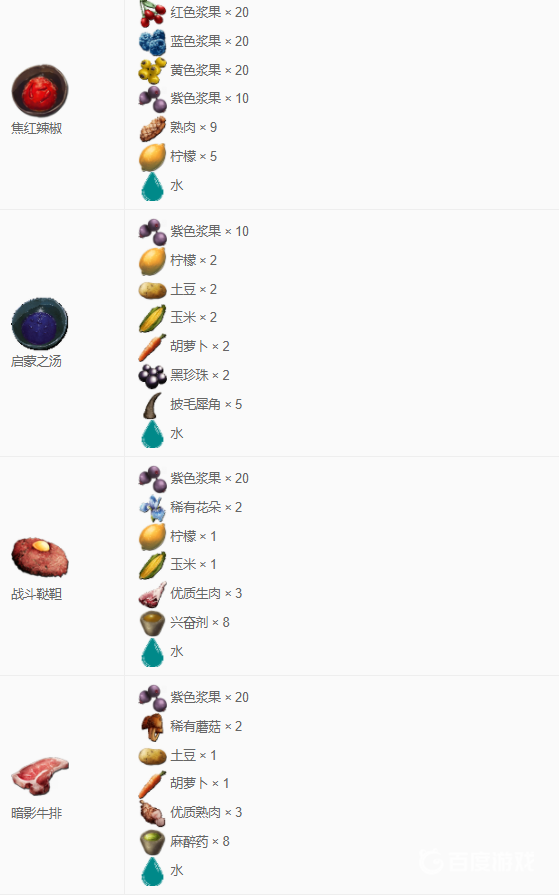 7、焦紅辣椒:紅色漿果 × 20、藍色漿果 × 20、黃色漿果 × 20、紫色漿果 × 10、熟肉 × 9、檸檬 × 5、水