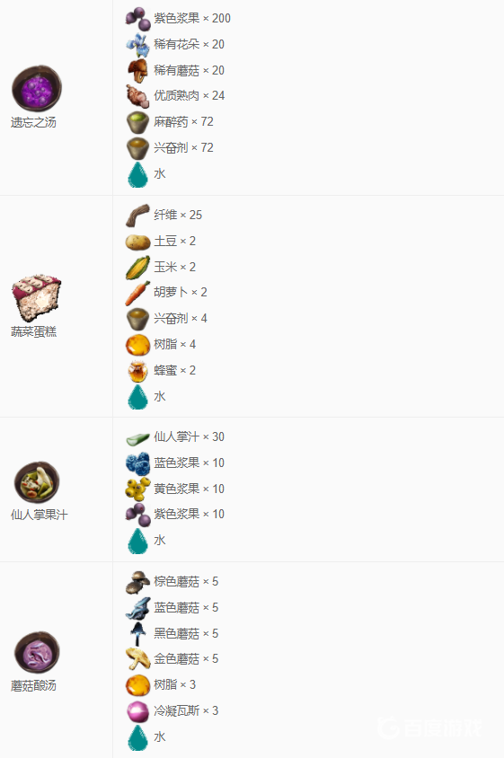 11、遺忘之湯:紫色漿果 × 200、稀有花朵 × 20、稀有蘑菇 × 20、優質熟肉 × 24、麻醉藥 × 72、興奮劑 × 72、水