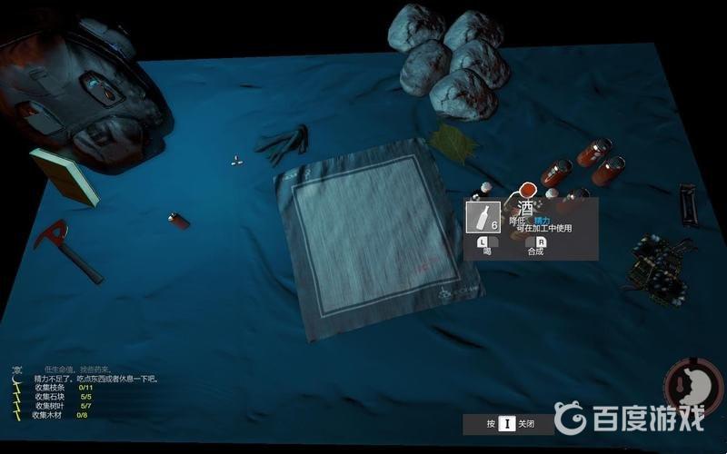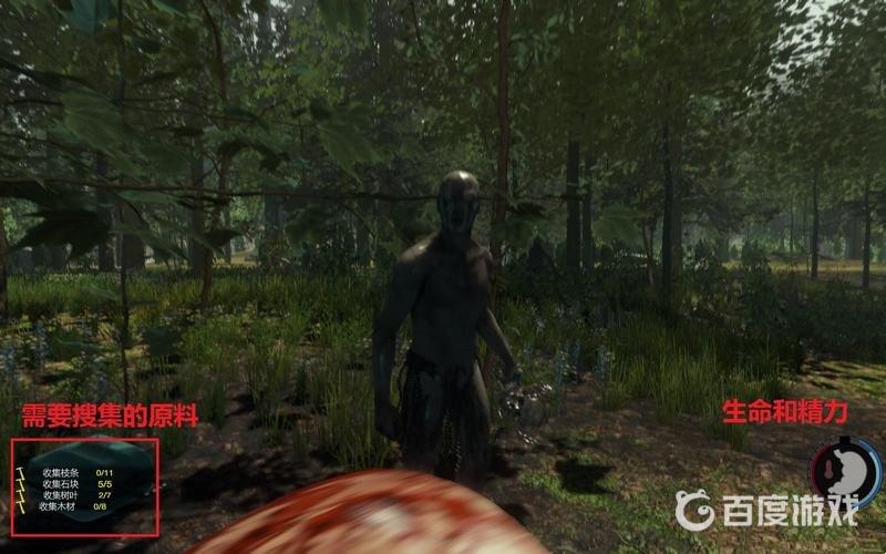 左下方會顯示目前修建的建築需要搜集的原料。右下方紅色代表生命,藍色代表精力。生命:角色的生存能力,降為0則死亡或昏迷被俘。精力:角色行動會消耗精力,靠食物和休息進行補充。