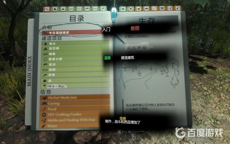 遊戲建築和信息的基本工具界面。玩家可以通過該界面進行建築設置。目前遊戲信息還不可用。玩家可以通過點擊生存指南的建築項目進入分目錄。這裡會顯示建築的功能和所需的材料。最後通過點擊相應建築進行放置建設。