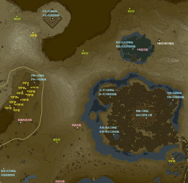 荒野之息全部神廟所在不同地區的不同地圖位置如下(圖中藍色文字即為神廟位置):