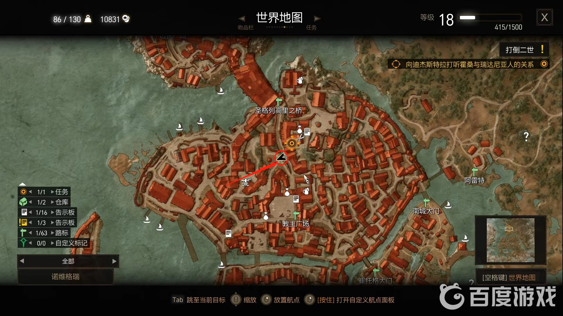 1、在巫師3里,向迪科斯徹打聽霍桑與瑞達尼亞人的關系這個任務需要找到澡堂里的迪科斯徹。首先我們看地圖,澡堂的位置就在聖格列高里之橋的下邊,我們前往到地圖的位置。