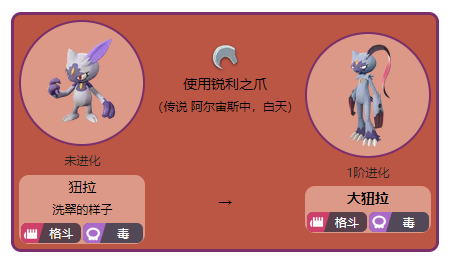 首頁 寶可夢傳說:阿爾宙斯 問答 寶可夢傳說:阿爾宙斯大紐拉怎麼進化? 2022-07-01 在寶可夢阿爾宙斯中,大狃拉已經是進化的最終形態了,無法再進化下去,如下圖所示,當對狃拉使用銳利之爪時,就可使其進化成大狃拉。