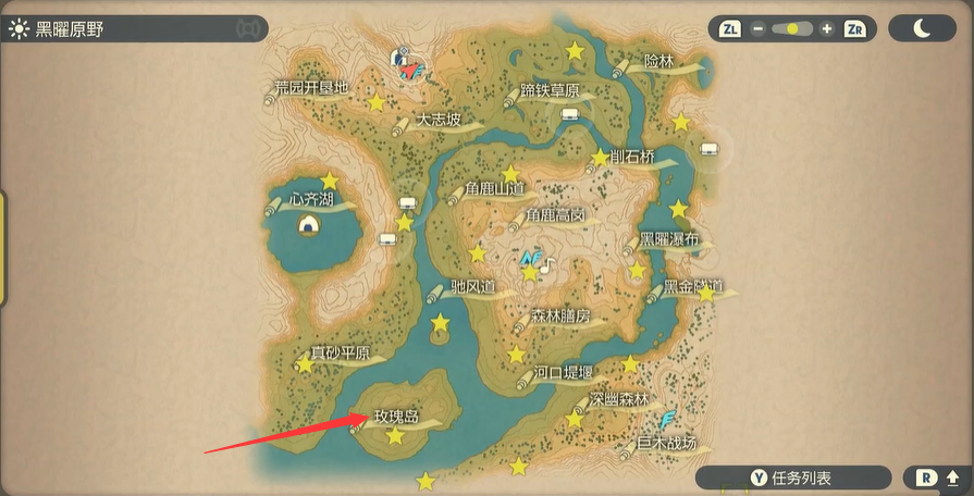 1、打開遊戲黑曜原野地圖,土地雲在地圖下端玫瑰島這里,標記玫瑰島位置;
