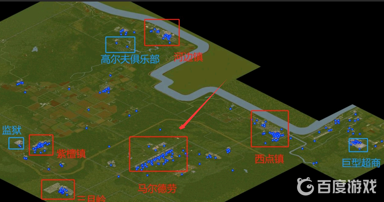 2、馬爾德勞,馬鎮其實不適合萌新建家,主要是僵屍太多,但架不住資源豐富,幾乎所有東西一應俱全,如果是游戲老手會比較喜歡馬鎮開局。