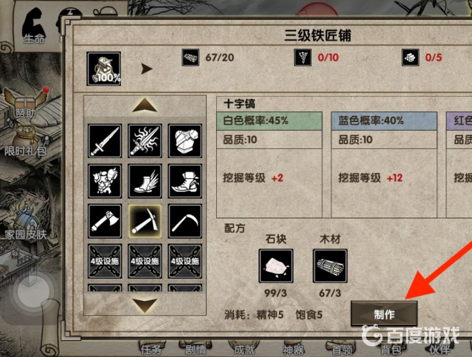 首頁 荒島求生 問答 荒島求生石頭怎麼開採? 2023-02-10 1、進入荒島求生遊戲,點擊鐵匠鋪進行製作。2、進入鐵匠鋪,選擇十字鎬進行製作,用來採集礦石。3、按照配方獲取相對應的材料,點擊製作,獲取十字鎬。4、在島上用十字鎬把大石頭敲碎即可獲取(需要敲4下左右)。