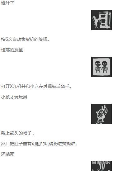 隱藏成就出了4個孩子成就,就是收集殘影的成就,荒林的孩子,學校的孩子,生病的孩子,蒼白的孩子外,還有每關一個條件達成成就,第一關是戴獵人帽子殺死獵人獲得平等狩獵成就, 第二關是在學校戴球帽子過球門成就裁判!第三關是醫院第一次見到爬的手的小怪的時候打死後再砸三次,獲得還裝死!成就。還有一個是最後第三關boss不是鑽進爐子里嗎。別燒死他。獲得總之,別傷害他成就。