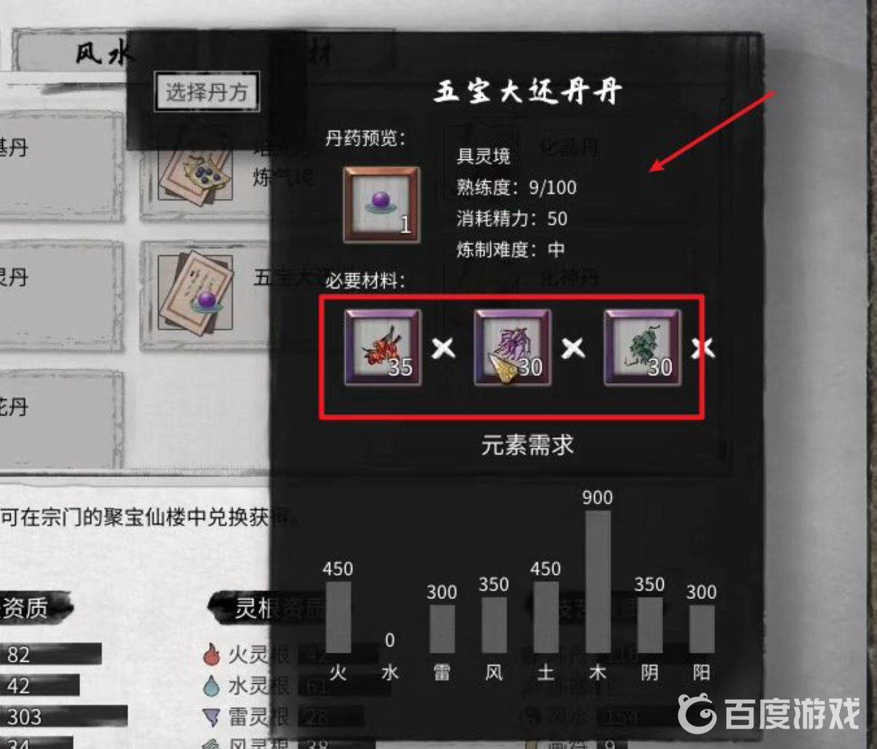 2、在技藝中打開丹方,找到五寶大還丹配方。