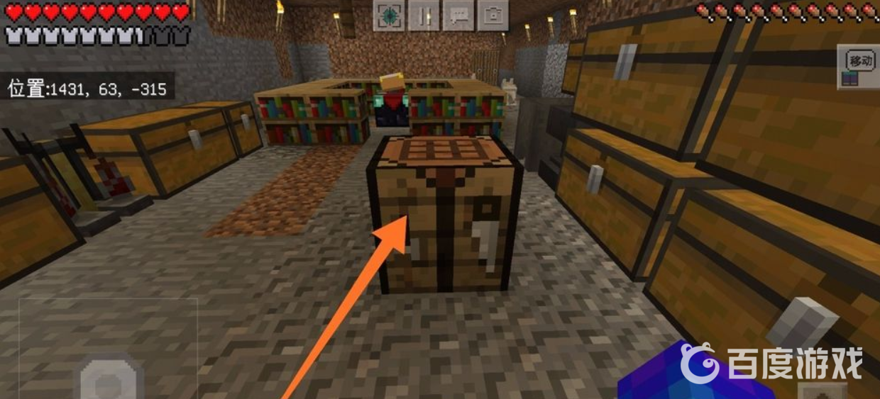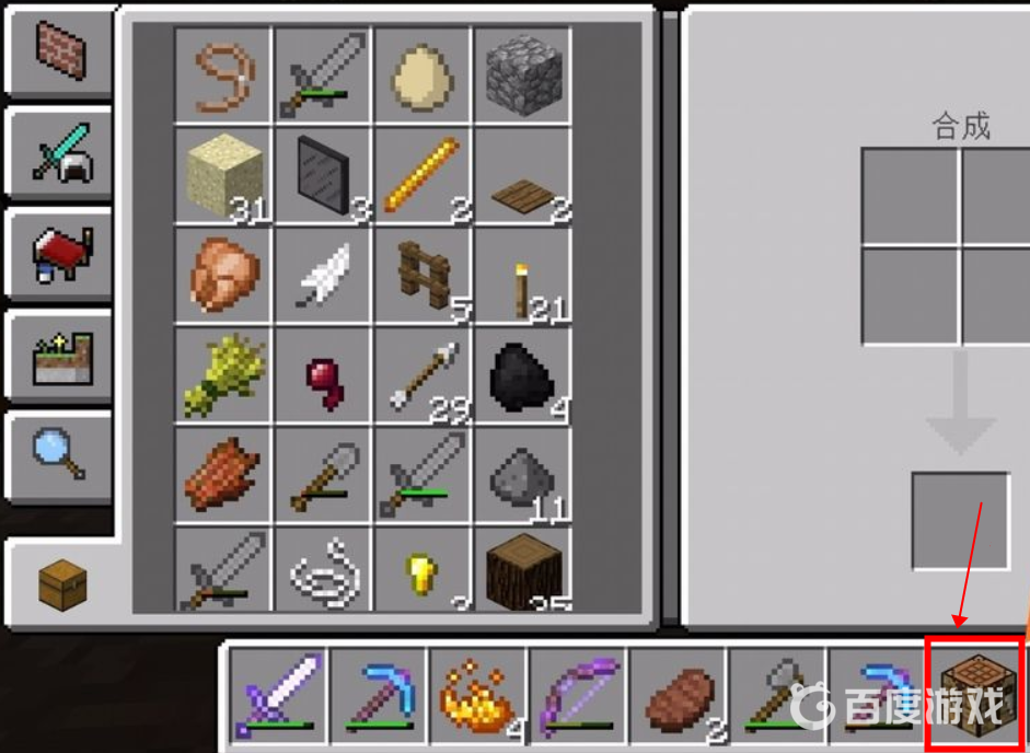 3、合成橡木板之後,我們點擊自己的背包,然後發現可以合成工作台。我們點擊合成工作台,然後將工作台放在快捷工具欄中。然後再將工具台放置在地面上即可,如下圖所示。