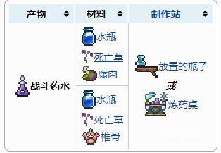 1.戰鬥藥水製作方式: 合成獲得:在煉藥桌或者放置的空瓶子處,使用1個水瓶 1個死亡草 1個腐肉,可以合成獲得1個戰鬥藥水,或者使用1個水瓶 1個死亡草 1個椎骨,可以合成獲得1個戰鬥藥水。