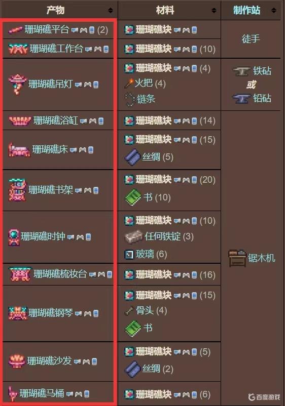 首頁 泰拉瑞亞 問答 泰拉瑞亞礁塊怎麼獲得? 2023-02-10 在遊戲《泰拉瑞亞》中,玩家可以製作獲得礁塊,可以用2個珊瑚礁平台徒手製作獲得; 或者用石塊、珊瑚和貝殼在水或水槽中製作獲得; 也可以用4個珊瑚礁牆在工作台中製作獲得。珊瑚礁塊是一種裝飾物塊,可以用來製作珊瑚礁傢具,具體製作圖如下:
