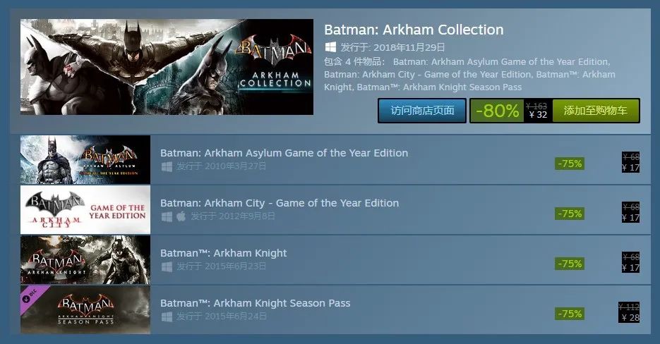 想要入手《蝙蝠俠》阿卡姆三部曲的全部作品,也可以選擇購買《蝙蝠俠:阿卡姆合集》,這款合集包現正優惠80%售價32元,除了包含三部曲外還含有《蝙蝠俠:阿卡姆騎士》季票 DLC。