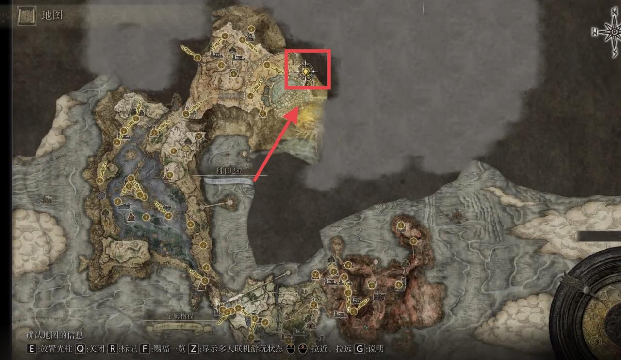 1、艾爾登法環龍裝大樹守衛在地圖的右上角位置,它沒有地點名稱,具體位置如下圖所示。
