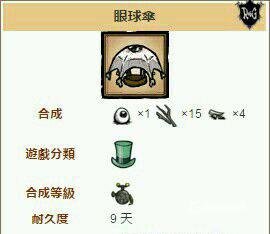 眼球傘的主要材料是巨鹿掉落的眼球,可能許多高玩早在入冬前就擊殺的遠古犀牛,等著巨鹿的到來製作眼球炮塔,有多少同學是這樣的呢(lz默默的舉起了手)的確很多玩家會選擇製作炮塔而不是眼球傘。其實眼球傘的功效也有很多1.100%防雨,2.防雷3.夏天隔熱240s,所以說眼球傘是過春夏的神器,在夏天就不需要耗費精力去做什麼冰帽啊,碎花襯衫什麼的,一把眼球傘基本就夠用了。因為單單一把雨傘是不能達到100%防雨的,製作眼球傘也能讓機器人玩家下雨的時候既解放了雙手又免受雨淋,綜合來說,雖然眼球傘雖然造價比較高,但是在飢荒所有道具中的屬性都是十分優秀的,sw中雙層傘帽同理。