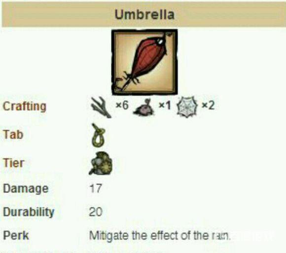 雨傘的排名這麼靠前,可能許多小夥伴就不理解了,都覺得雨傘只有下雨的時候會用,其實雨傘還有隔熱120s的效果,加上90%的防水,而雨傘所需要的材料只有6×樹枝,2×蜘蛛網,1×豬皮。這些材料都是很容易獲得的,而且只需要一本即可解鎖雨傘,蜘蛛網樂意通過擊殺蜘蛛有幾率掉落,或者拆一個蜘蛛巢,一級蜘蛛巢掉落的蜘蛛網就夠做一把傘了,豬皮可以通過殺豬人,拆豬屋(sw不推薦這樣做),砸豬人頭,或者你可以把四塊怪物肉餵給同一隻豬人,這隻豬會變成瘋豬,然後殺了它就能獲得2x大肉和1x豬皮了。單獨靠雨傘是不能達到100%防雨的,其他角色其實一場小雨撐把傘就夠了,但是機器人玩家淋到一點雨就會開始掉血,這個時候最好的辦法就是帶上帽子,前期的話可以選擇帶草帽(草帽在夏天也有60s的隔熱效果)後期什麼豬皮帽、高禮帽啊什麼的配合雨傘都可以達到100%防雨,機器人玩家最好盡早做出雨傘,配合草帽就不需要畏畏縮縮的蹲在樹下了,草帽和雨傘可以讓你輕鬆的度過前期難過的雨天。雨傘在夏季的120s隔熱效果也不能忽視,在非戰斗狀態的時候舉著把雨傘也能達到非常好的防熱效果,因此非常推薦大家製作