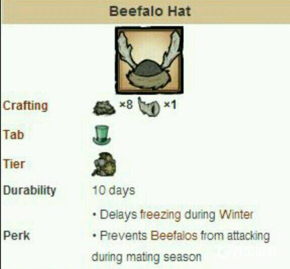 牛帽是我過冬前必做的一個帽子,有著長達240s的保暖時間,(之前有發溫度變化的計算公式)和冬象背心、熊皮背心、鯨脂背心(sw)並稱為飢荒最保暖的衣物,其中牛帽是造價最低廉的,一切製作材料都可以從牛身上獲得,牛毛的獲得方法這裡也給大家普及一下,晚上的時候拿起剃刀對睡著的牛點一下,3塊牛毛就會掉出來,然後再殺死被剃了毛的牛還會有3塊牛毛和四塊肉掉出來(和mc里殺了剃過毛的羊怎麼不一樣)這個知識知道的人應該也不在少數吧,牛角也是殺牛有幾率掉落的,掉率是33.3%。穿上牛帽不僅可以保暖還可以讓冬和春季發情的牛不攻擊你,可能因為戴了牛帽的你也像一頭牛吧= =