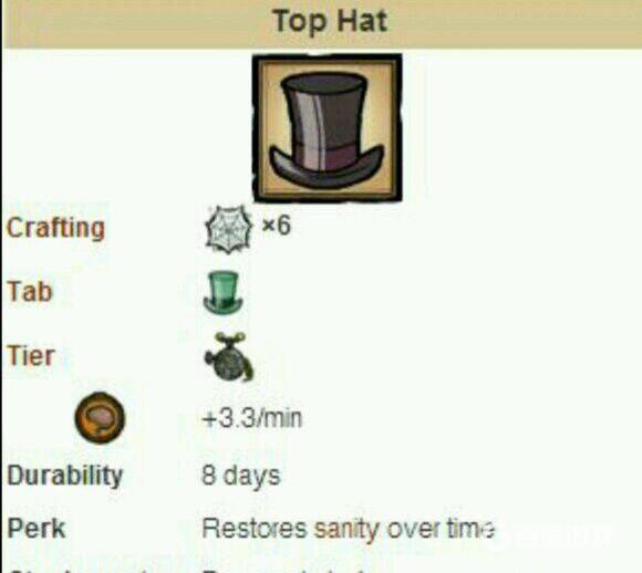 高禮帽是飢荒里前期的回san神器,有著低廉的造價和高額的san值收益,只需要6個蜘蛛網,白天佩戴時 3.3san/min,黃昏和黑夜固定-5san/min,戴上高禮帽以後大概只有-1.7san/min,基本上在白天佩戴高禮帽的san值收益完全可以彌補甚至超過黃昏和黑夜損失的san值,特別適合玩大力士和老奶奶的同學使用,耐久也有8天,只需要一本即可製作。