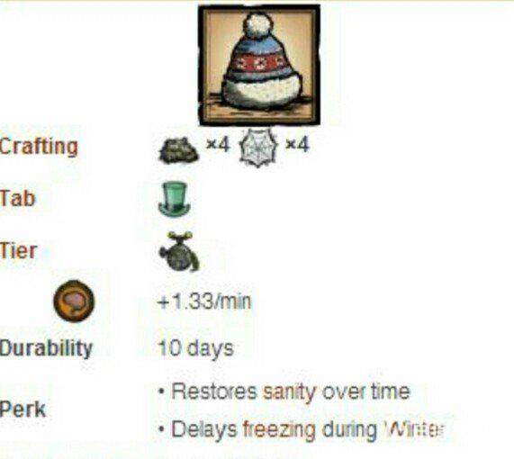 寒冬帽和牛帽基本上是每個玩家入冬前必備的衣物,這裡不推薦大家製作棉襖過冬,棉襖會佔用護甲和背包的格子,冬天又是探圖的季節可能會收獲很多東西,所以最好背個包在身上,(五個裝備欄當我沒說)寒冬帽造價低廉,而且能提供 1.33san/min的精神回復,製作也只需要4個牛毛4個蜘蛛網,寒冬帽也有一些缺點,就是使用期只有較短的10天,而一個冬天有半個月左右,如果不及時找到海象巢得到海象帽的話可能就要製作兩個寒冬帽了,另外它的保暖時間也只有牛帽的一半,也就是120s,但是綜合來說還是一個性價比比較高的保暖衣物