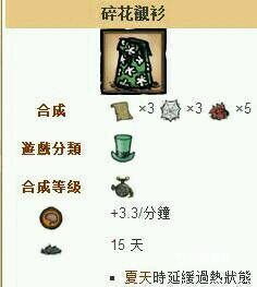 碎花襯衫應該是大部分玩家夏天的首選,這裡順便提下其他的防暑的衣物道具,春鵝掉落的羽毛可以用來製作羽毛扇,煽動可以降溫,巨鹿掉的眼球製作的眼球傘也可以達到保溫240s的效果,這兩樣衣物十分防暑效果很好,但是造價也不低,有條件的玩家可以製作,當然留著眼球合成炮塔也是很實用的。另外能防暑的物品有冰暖石、西瓜帽(120s)、夏季背心(120s)、草帽(60s)、花傘&雨傘(120s)、冰塊帽和這裡介紹的碎花襯衫都是保暖240s。這裡不推薦製作西瓜帽和冰帽,西瓜帽的保溫效果差,會帶來高額的潮濕度(可配合晨星使用)而且使用期只有很短的幾天,冰帽雖然保溫時間長,當時需要冰塊填充,還會帶來減速效果,所以不推薦製作。碎花襯衫的耐久不是按百分比掉的,而是和食物一樣有自己的保鮮度,因此也不能用針線包修補,夏季可能有十七八天的樣子,碎花襯衫的使用期剛好是15天,基本上襯衫壞了夏季也過去了。碎花襯衫還能夠帶來高額的san值收益,和高禮帽一樣都是3.3san/min,材料也很簡單,沼澤里的蘆葦製作成紙×3和蜘蛛網×3,還有就是夏季仙人掌會長花,去沙漠採集仙人掌也會獲得仙人掌花(僅夏季),一共要5朵