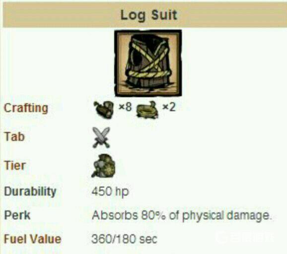 這應該是飢荒玩家們最親密的兩個朋友了,從做一本和二本開始這兩件防具就一直保護著我們,豬皮頭和木甲都是450的生命值,單件免傷都是80%,兩件一起穿的話好像能達到96%(不一定是,沒有實際計算過)這兩件防具的造價也不能再低了,木甲只需要一本解鎖,豬皮頭需要二本。另外給萌新們普及一下第一次製作了一本也就是科學機器必須製作的道具:背包、木甲、長矛、鏟子、剃刀、(威爾遜和韋伯)。可選:草席、剃刀(其他玩家)木板、石磚,當然材料充足的同學推薦把二本和一口鍋打包在身上(打包:製作科技完成點一下滑鼠右鍵)木甲所需要的材料只有木頭x8和2x繩子,豬皮頭的材料呢需要豬皮x1和繩子x1,都是性價比極高的防具,無論是20天還是120天,都是我們穿在身上保護我們的忠實夥伴