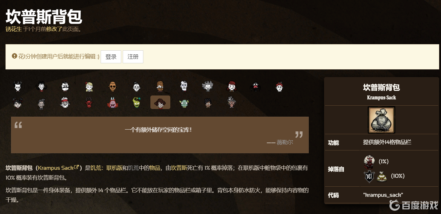 是坎普斯背包。坎普斯背包是一件身體裝備,提供額外14個物品欄。它不能放在玩家的物品欄或箱子里。背包本身防水防火,能夠保持內容物的乾燥。