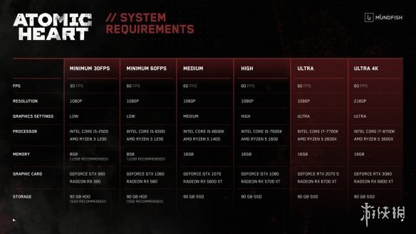 Mundfish公布了FPS新作《原子之心》的詳細PC配置要求,我們看到,想要1080p/60幀(低畫質)暢玩這款遊戲,最低配置需要GTX1060/RX 580的顯卡,如果你想要1080p/60幀 高畫質遊玩它,你需要GTX 1080/RX 5700XT顯卡。