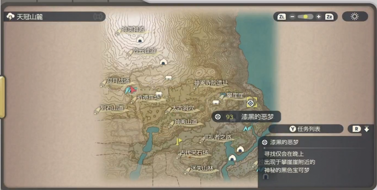 1、阿爾宙斯漆黑的惡夢領主夢達克萊伊的刷新點就在天冠山麓的攀崖崖下邊。
