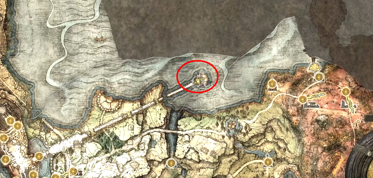 在地圖找到紅圈的地方就是寧姆格福神授塔,玩家可以在這里解鎖大盧恩裝備功能,擊敗主線的半神BOSS可以獲得題目的大盧恩。