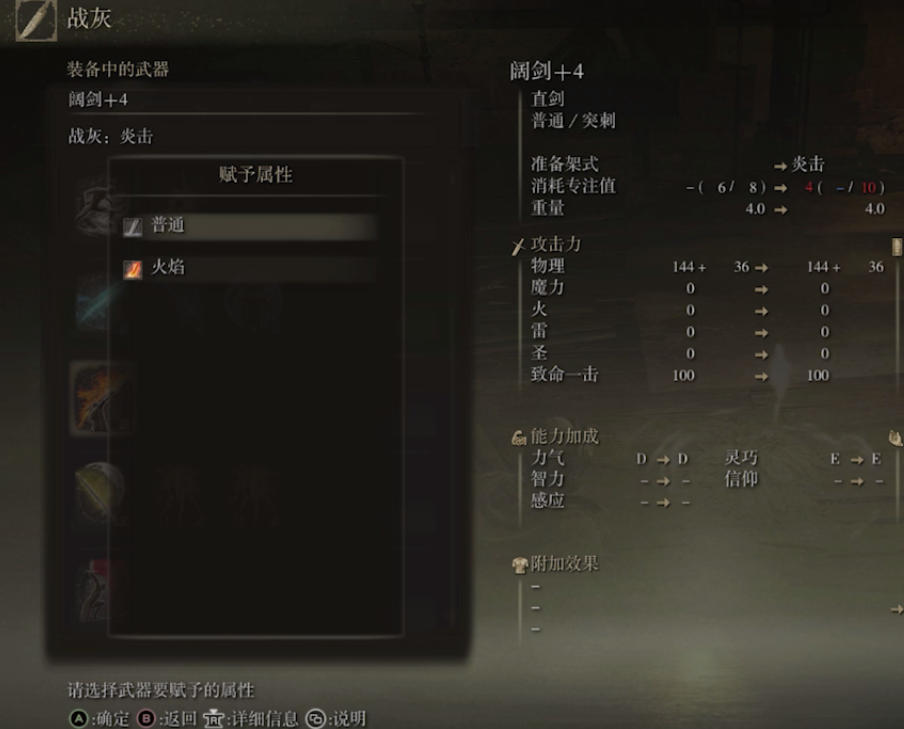 首頁 艾爾登法環 問答 艾爾登法環怎麼賦予屬性? 2022-07-01 艾爾登法環中給武器賦予屬性是依靠戰灰系統的,具體操作如下1.首先選擇賜福點賜福,選擇戰灰選項。2.然後在戰灰系統中選中武器後,就可以賦予屬性,如下。