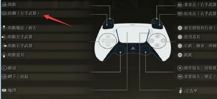 在游戲「艾爾登法環」中,根據下圖的手柄按鍵就可以看到,按住L1鍵就可以利用左手武器進行防禦了。並且利用好時機我們還可以進行防禦反擊。
