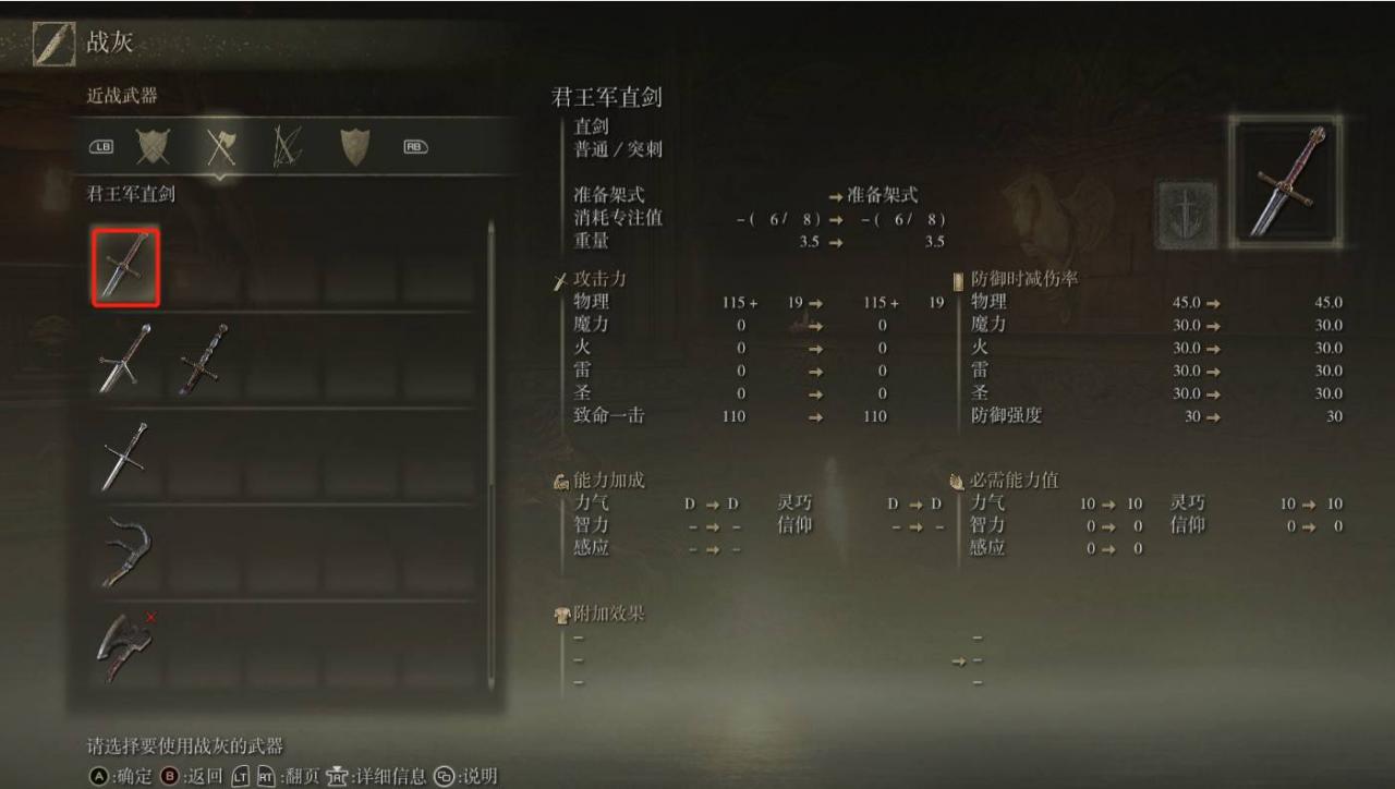 首頁 艾爾登法環 問答 艾爾登法環怎麼釋放戰灰? 2022-07-01 艾爾登法環釋放戰灰有兩種方法,第一種就是按LT,然後就可以把戰灰穿上了;第二種如下所示:首先在賜福處休息或者與一些鐵匠對話,選擇戰灰選項然後選擇你需要附加戰灰的武器然後選擇需要附加的戰灰,不同的武器可以附加的戰灰可能會不一樣,這個主要是和武器的種類有關有的戰灰可以選擇附加的屬性,不同的屬性也會影響武器的能力加成,附加成功之後武器戰技會被替換,具體如下圖