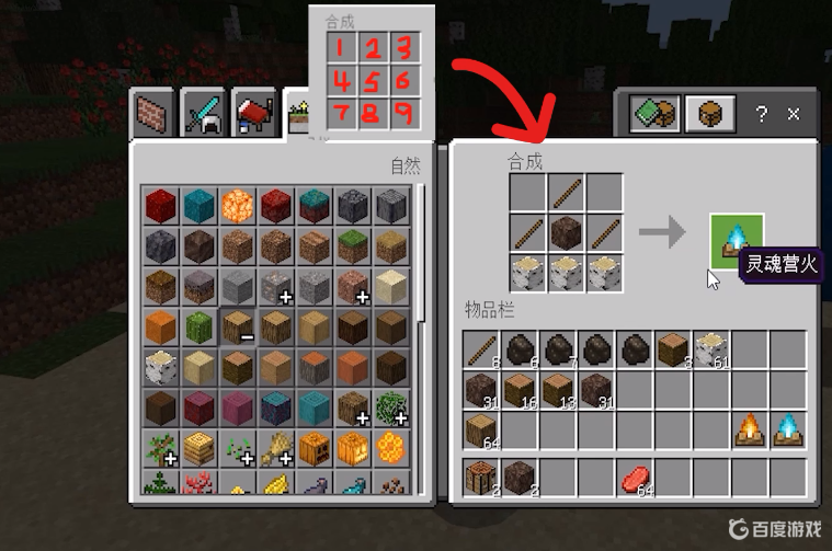 如下圖所示,營火為紅色火焰,靈魂營火為藍色火焰。營火合成配方為木棍、木炭和任意原木,而靈魂營火合成配方為木棍、靈魂沙和任意原木。